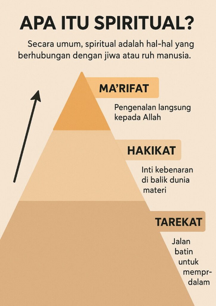 Secara umum, spiritual adalah hal-hal yang berhubungan dengan jiwa, batin, atau ruh manusia—bukan fisik atau materi. Orang yang memiliki perhatian terhadap spiritual berarti sedang mencari makna hidup, kedekatan dengan sesuatu yang lebih tinggi (Tuhan), dan pembersihan diri dari sifat-sifat buruk menuju kebaikan sejati.