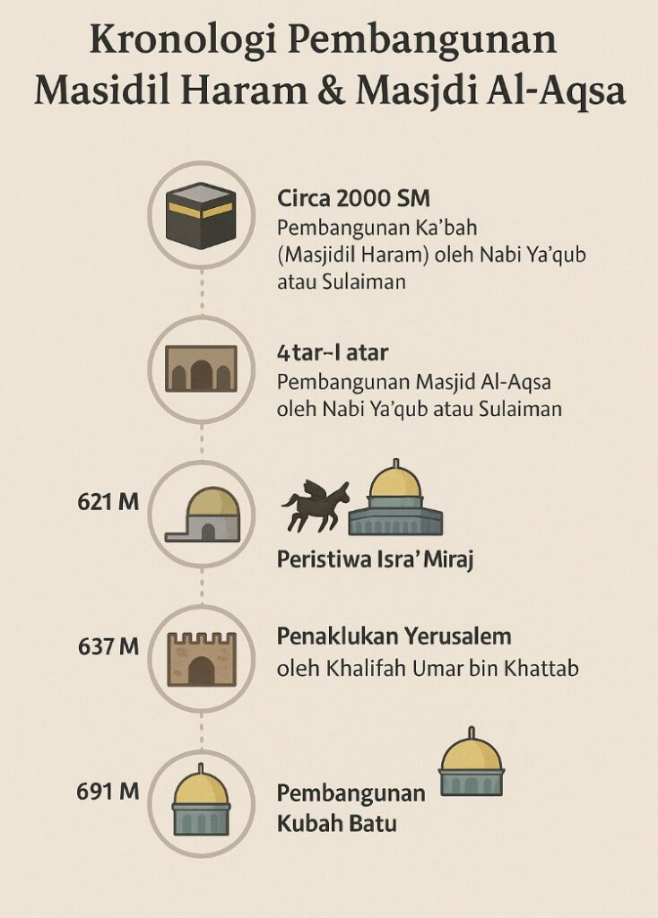 Berikut ini adalah ilustrasi kronologis pembangunan Masjidil Haram dan Masjid Al-Aqsa berdasarkan riwayat Islam (Al-Qur’an dan Hadis sahih), disusun secara runtut agar mudah dipahami: