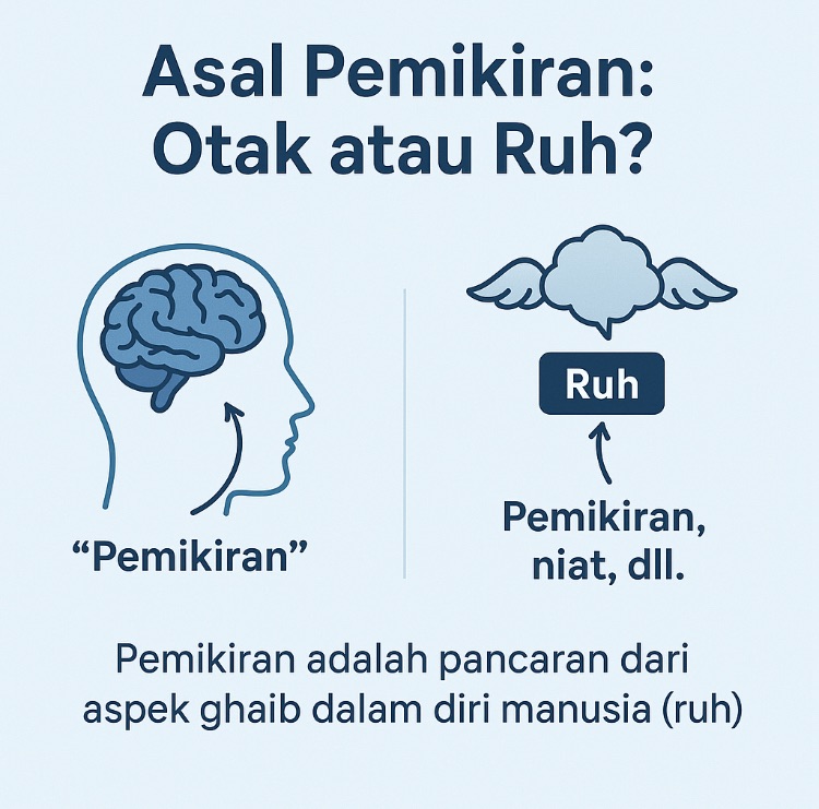 Pemikiran bukan hanya aktivitas fisik otak, tapi pancaran dari aspek ghaib dalam diri manusia (ruh). Ateis terjebak hanya di dimensi lahiriah manusia, padahal manusia memiliki dimensi batiniah yang dalam dan tak kasatmata. Islam mengakui peran logika (akal), tapi juga memuliakan hati dan ruh sebagai pusat kesadaran dan makna sejati.