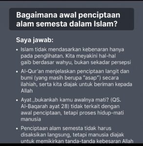 Al-Qur’an jelas menjelaskan bahwa Allah menciptakan langit dan bumi, bahkan dari “asap” atau dukhan sebagai tahap awal penciptaan kosmos: