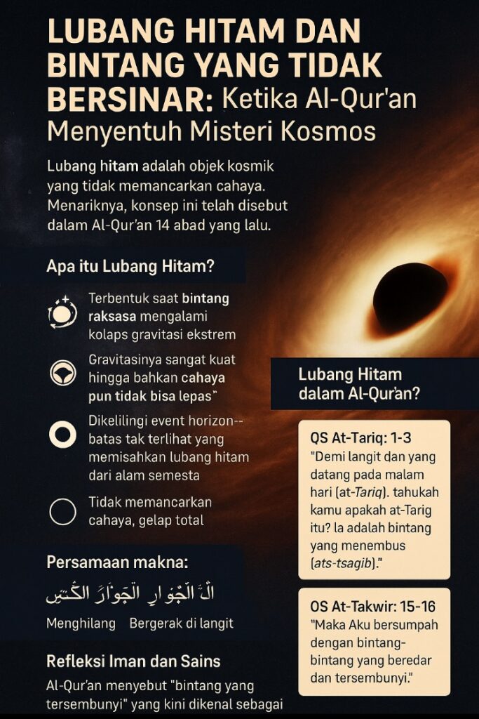 Lubang hitam adalah salah satu objek paling misterius dalam alam semesta. Ia tak dapat dilihat secara langsung, karena tidak memancarkan cahaya. Namun, keberadaannya dapat dideteksi dari efek gravitasinya terhadap benda-benda di sekitarnya. Menariknya, konsep tentang bintang yang tidak bersinar telah disebut dalam Al-Qur’an 14 abad sebelum istilah “black hole” muncul dalam kosmologi modern.