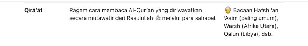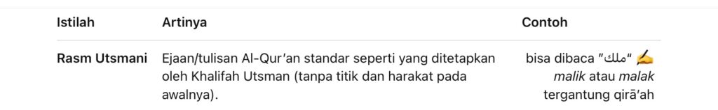 Jadi: rasm itu tulisan bakunya, sedang qirā’āt adalah gaya bacaan yang masih bisa beda sedikit *namun tetap mengikuti tulisan baku rasm Utsmani dan datang dari Nabi ﷺ melalui sanad yang sahih.